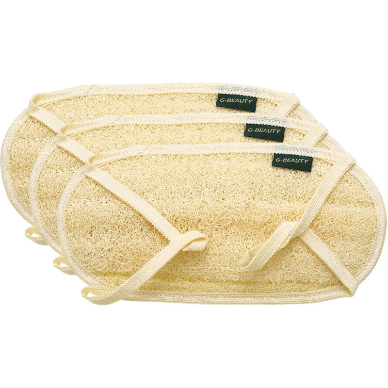 ليفة تدليك بيضاوية طبيعية مزدوجة الوجه من جي بيوتي GBY-016 بمقبض من القماش للاستحمام والسبا والدش - مجموعة من 3 قطع - بيج