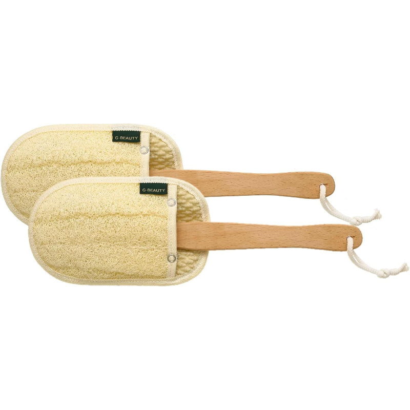 ليفة تدليك بيضاوية طبيعية مزدوجة الوجه من جي بيوتي GBY-025 بمقبض خشبي وحزام خطاف للاستحمام والسبا والدش - طقم من قطعتين - بيج