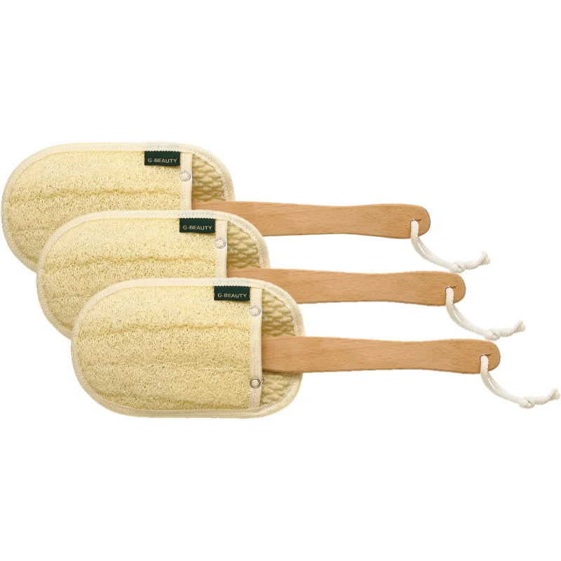 ليفة تدليك بيضاوية طبيعية مزدوجة الوجه من جي بيوتي GBY-025 بمقبض خشبي وحزام خطاف للاستحمام والسبا والدش - مجموعة من 3 قطع - بيج