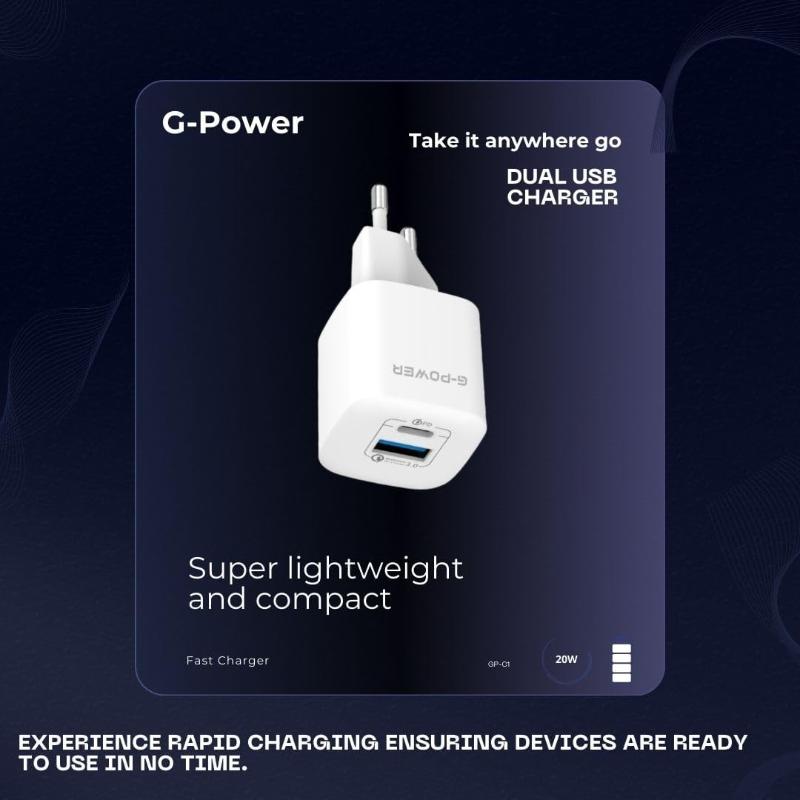 يوفر شاحن G-Power GP-C1 ثنائي منافذ USB شحنًا سريعًا بقوة 20 واط مع منفذي USB-A وUSB-C. صُمم هذا الشاحن لضمان الكفاءة والراحة، ويوفر طاقة موثوقة لأجهزتك، بلونه الأبيض الأنيق، مثاليًا للاستخدام المنزلي أو أثناء السفر.