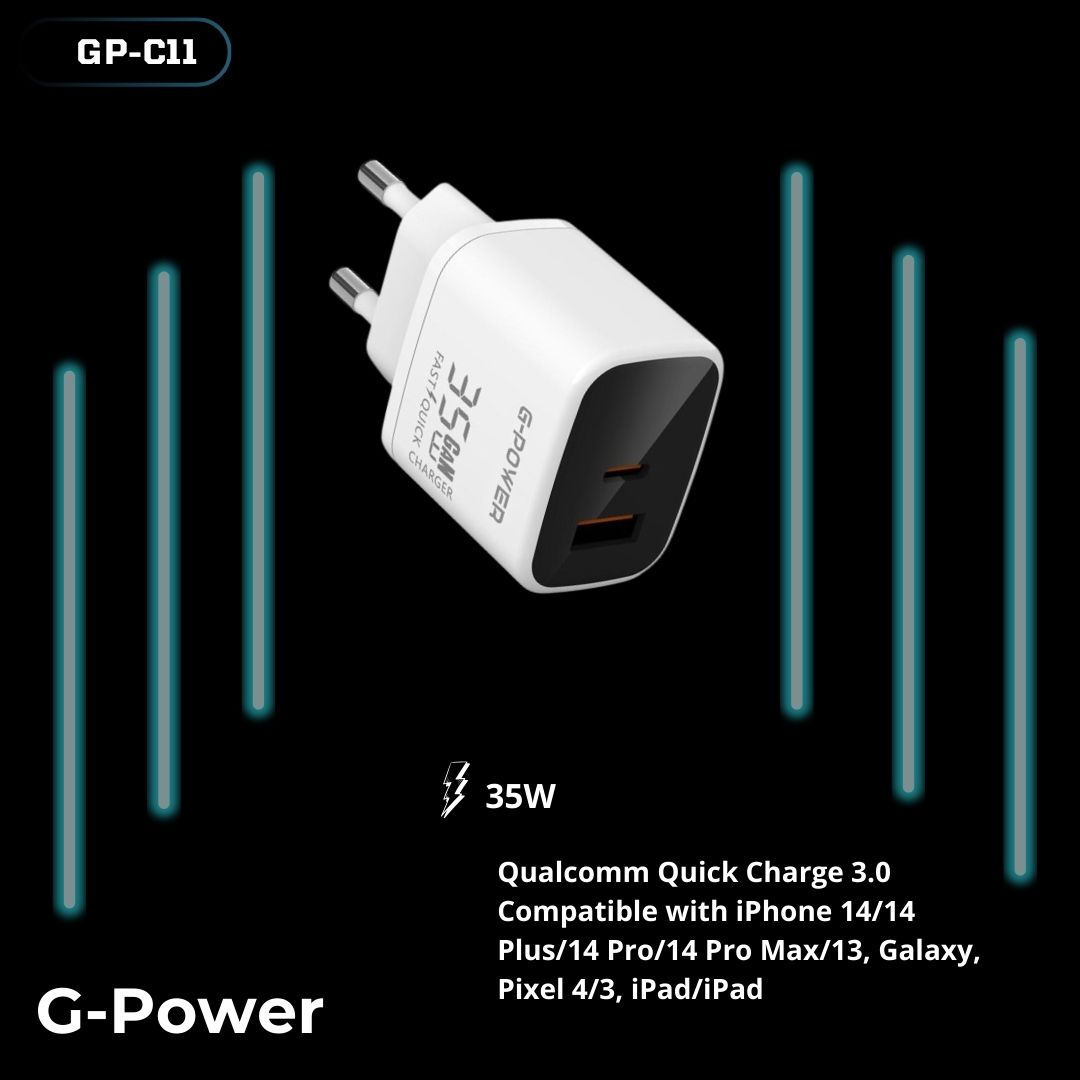 شاحن G-Power GP-C11 ثنائي USB بقوة 35 واط يوفر شحنًا سريعًا بتقنية Qualcomm Quick Charge 3.0. يتميز بمنفذي USB-A وUSB-C. تصميمه الأبيض الأنيق يضمن طاقة موثوقة وفعالة لجميع أجهزتك.