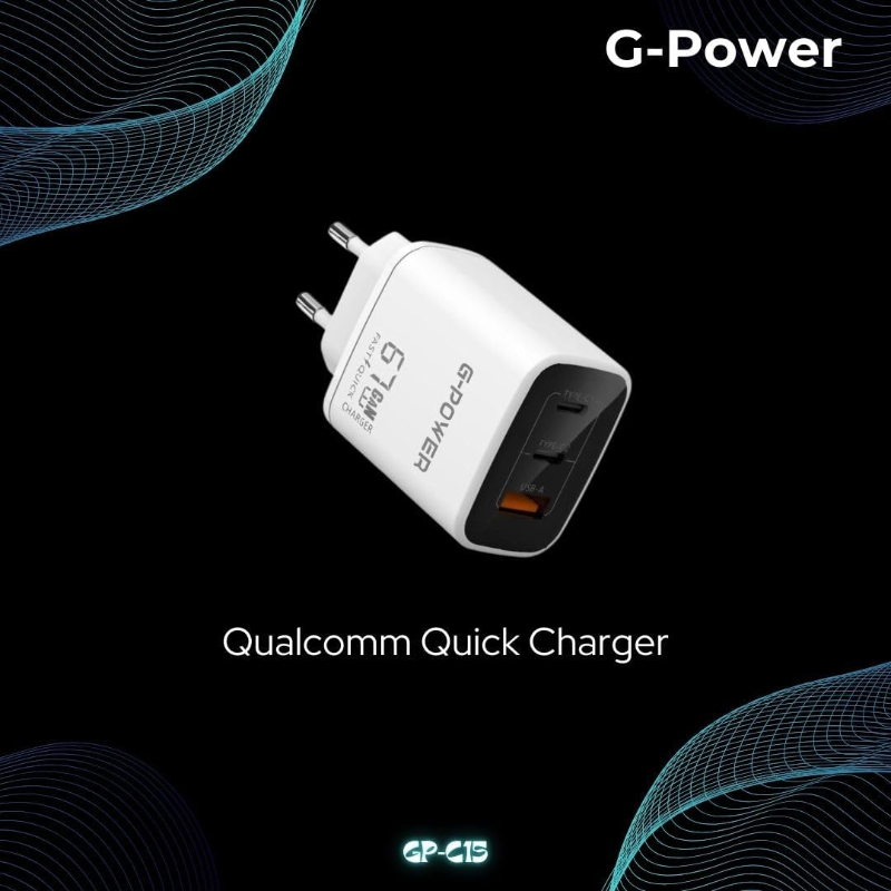 شاحن G-Power GP-C15 ثلاثي المنافذ بقوة 67 واط، مزود بتقنية Qualcomm Quick Charge 3.0 لشحن سريع وفعال. مع منفذ USB-A ومنفذي USB-C، يوفر الشاحن طاقة بقوة 67 واط، مما يضمن شحنًا سريعًا وموثوقًا لمجموعة واسعة من الأجهزة. تصميمه الأبيض الأنيق مثالي للاستخدام في المنزل أو المكتب أو أثناء التنقل.
