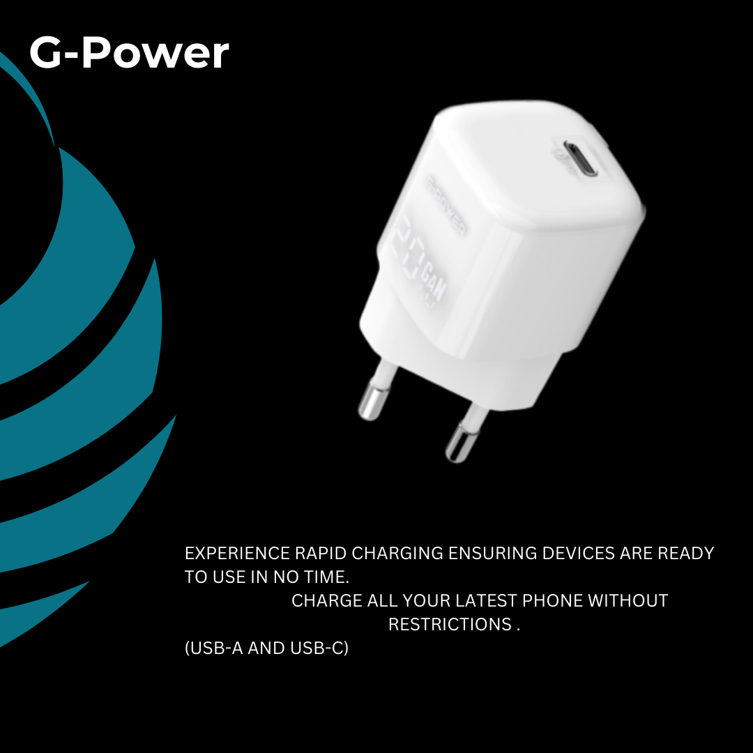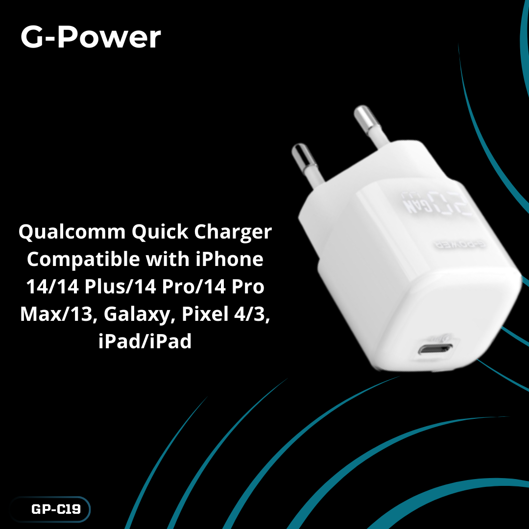 شاحن G-Power GP-C19 USB-C بقوة 20 واط مزود بتقنية Qualcomm Quick Charge لشحن سريع وفعال. متوافق مع أجهزة iPhone 14/13، وGalaxy، وPixel 4/3، وiPad، وغيرها، ويوفر طاقة موثوقة بتصميمه الأبيض الأنيق، مثالي للاستخدام في المنزل أو المكتب أو أثناء السفر.